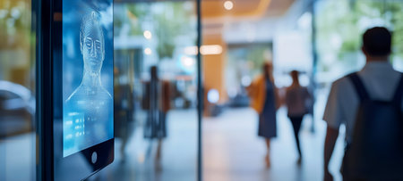 A biometric recognition device displayed in a modern urban setting with people walking by