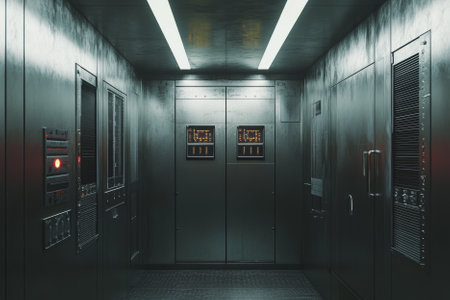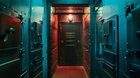 A sleek underground bunker 3D background room with metal-plated walls, digital control panels, and emergency lighting strips. The space is designed for survival, with high-tech security measures and a hidden escape route.