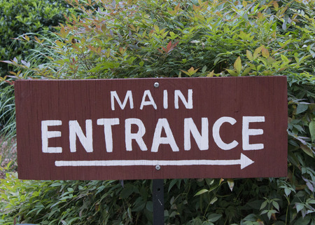 A Maroon Main Entrance Sign with an Arrow pointing to the right
