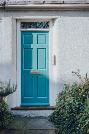 A vertical shot of a white wall with light blue wooden door and plants under a bright sunlight