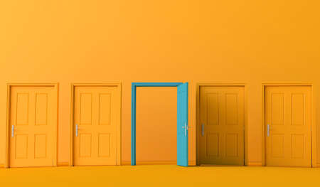 Orange door in the concrete wall of an industrial building. 3d rendering