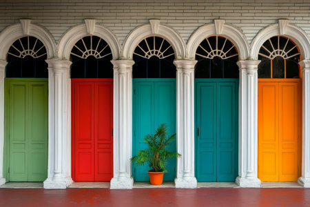 Colorful wooden doors in a row at the entrance to a house. generative ai