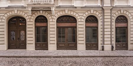 A urban city trendy blank wooden wall and glass window sliding door on a cold urban gritty street. City walls perfect for mockup or graphic design composition. cold street pavement and road.