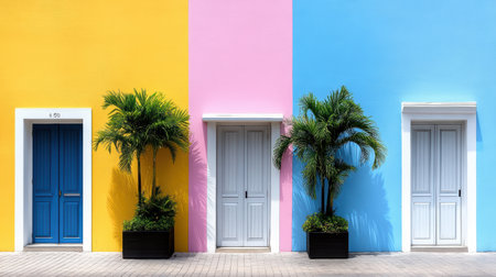 Vibrant architectural design featuring colorful walls, a wooden door, and a decorative plant in a bright setting. Ideal for showcasing modern architecture, tropical vibes, and creative outdoor decor style. AI Generated