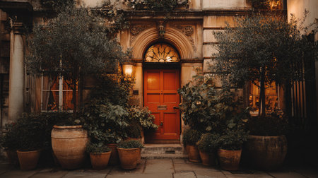 A captivating image of a vintage entrance featuring a vibrant door framed by lush potted plants, emanating warm ambiance in an urban setting.