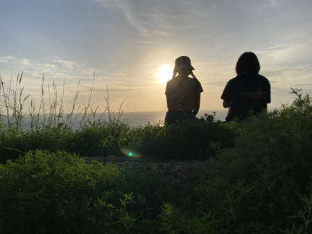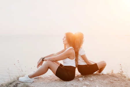 two girls are sitting on top of the hill, watching amazing sunset and sunlight reflects on sea waves and green grassland
