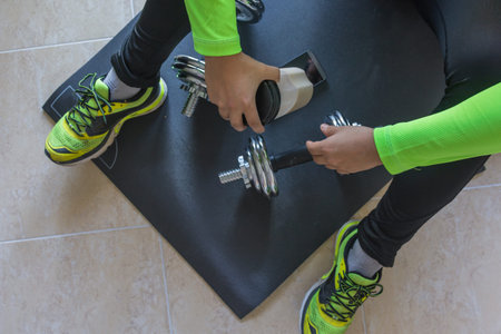 dumbbell and water bottle on the ground around the sport girl. woman's hands tying shoelaces on sport sneakers in gym.