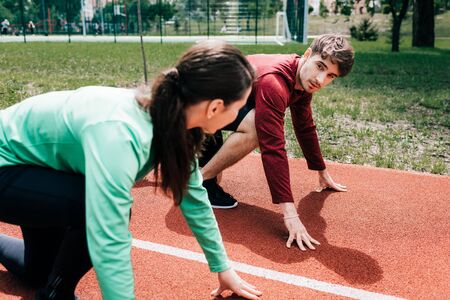 Selective focus of man looking at woman while standing in starting position on running track outdoors
