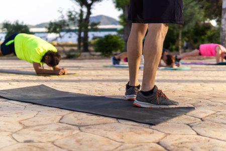 Fitness woman with personal trainer doing exercises on mat outdoors