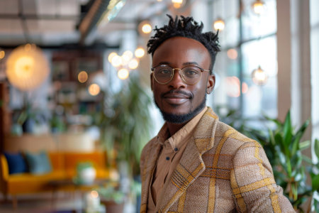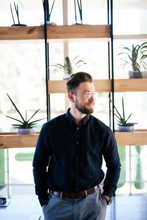 A smiling man with a well-groomed beard stands confidently in a stylish, minimalistic room, hands in pockets. The bright atmosphere, complemented by greenery, radiates positivity and approachability, making it perfect for professional or lifestyle themes.