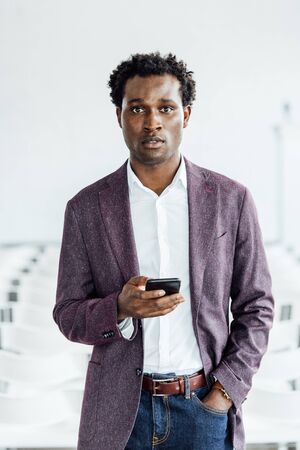 Portrait of businessman dressed in formal clothes using mobile phone standing inside near glass at building.