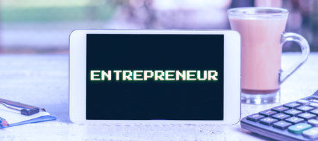 Text sign showing Entrepreneur. Business approach enterprise resource planning centralized database for business processes Phone Screen With Important Message On Desk With Keyboard, Pen And Coffee.