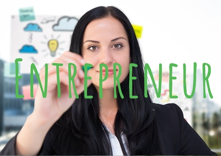 Digital composite of Young businesswoman writing ENTREPRENEUR on the screeem