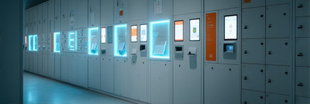 Smart locker wall interface indicates delivered status with illuminated display, showcasing an organized layout of lockers in a contemporary setting.