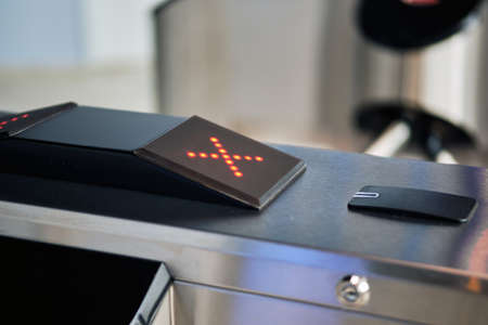 A modern turnstile shows a no passage sign in the form of a red cross.