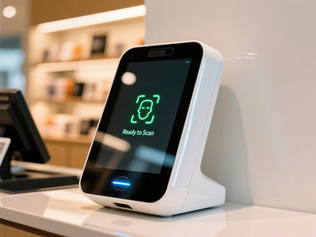 A sleek id scanner displaying scan id in a contemporary office lobby setting