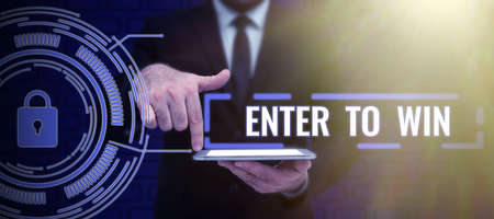 Text sign showing Enter To Win. Business concept Sweepstakes Trying the luck to earn the big prize Lottery Businessman in suit holding notepad symbolizing successful teamwork.