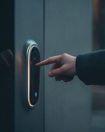 A person gently presses a futuristic digital door lock with a glowing interface. The setting is at dusk, highlighting the sleek design and modern architecture of the building.