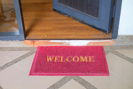 Red welcome doormat in front of opening door
