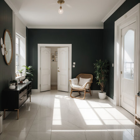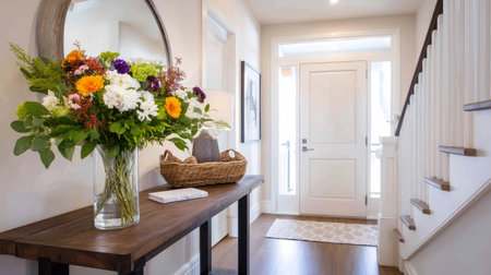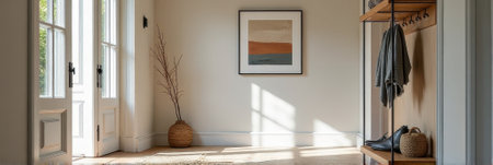 Bright minimalist entryway with abstract art and natural decor. That the image is generated using AI.