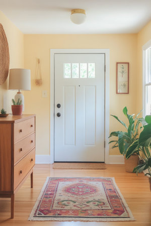 A photo of the interior of an entryway with light wood floors, white door and wall in background, colorful boho rug on floor, small wooden dresser to left side, lamp above dressers, modern decor, window to right side, light yellow walls, bright lighting, clean aesthetic, neutral color palette, shot from eye level --ar 2:3 --v 6.1 Job ID: f1d3f8fa-e903-410c-9ce1-caa0128dbcad
