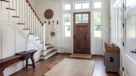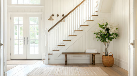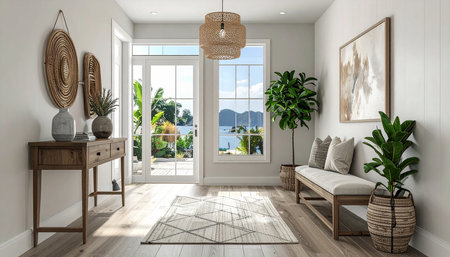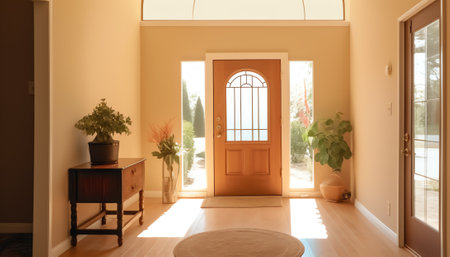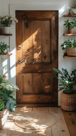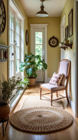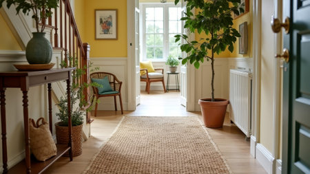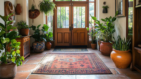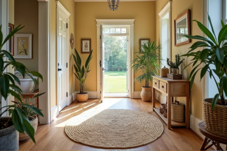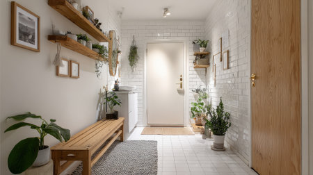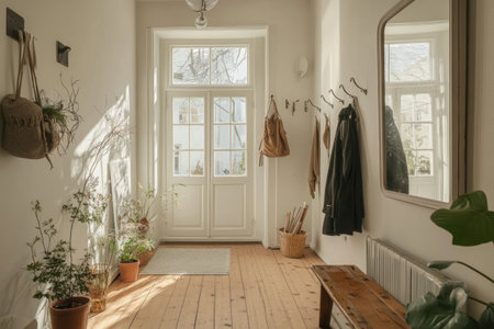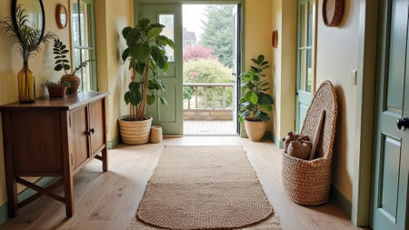 Bright cozy entryway with plants and natural decor. That the image is generated using AI.