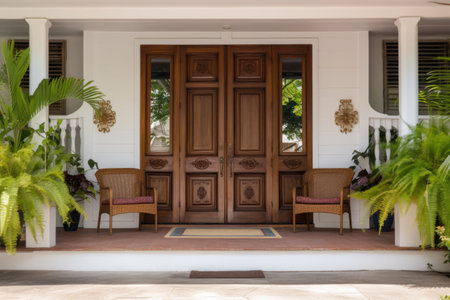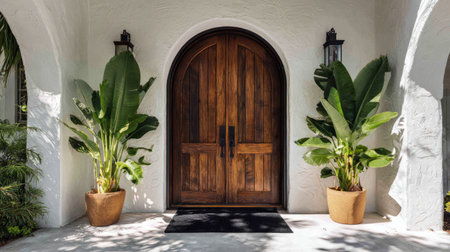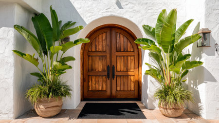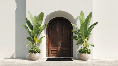 Arched tropical entry with rich wooden doors, bright white stucco wall, large banana plants standing in planters on each side, centered black doormat, natural daylight symmetry