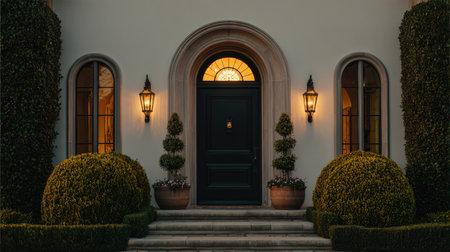 An exterior view showcases a classic house entrance featuring an arched door and surrounding architectural details. The image presents a balanced composition with warm lighting from lanterns and interior windows. The style suggests a refined aesthetic with a focus on symmetry, potentially suitable for real estate or architectural publications.