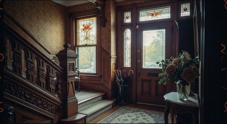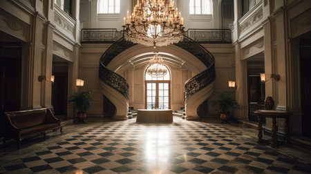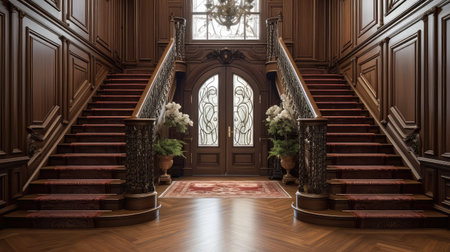 This image showcases the interior of a grand and opulent mansion,featuring a stunning hallway with intricate architectural details,including a magnificent staircase,ornate wood paneling,and a