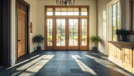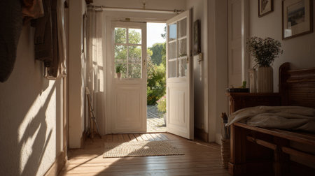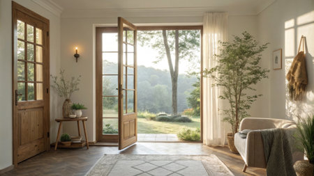 This image showcases a warm and inviting entryway bathed in natural light. Open doors reveal lush greenery outside, creating a serene and tranquil atmosphere in the home.