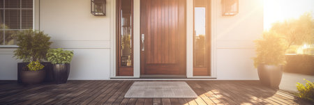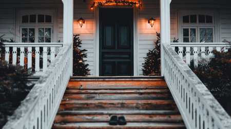 An inviting exterior view showcases a house with a front porch, wooden steps, and decorative elements. The composition focuses on the entrance, featuring steps leading to the door. The overall style suggests a homey environment, suitable for various editorial and commercial applications. The image is taken during the day.