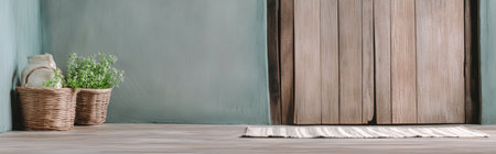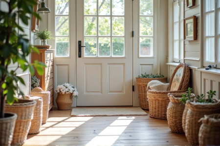 Cozy sunlit entryway with wicker baskets and greenery. That the image is generated using AI.