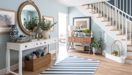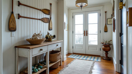 Cozy nautical-themed entryway with wooden decor and natural light. That the image is generated using AI.