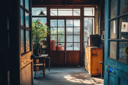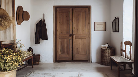 Bright rustic entryway with natural light and indoor plants. That the image is generated using AI.
