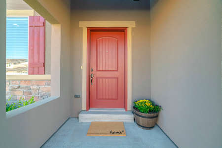 The red front door of a house with concrete exterior wall and shutters on window. Doormat and potted flowers are placed by the doorstep.