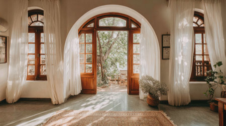 This image showcases a room interior with arched wooden doors and windows, inviting natural light. White curtains frame the windows, enhancing the airy feel. The composition emphasizes the play of light and shadow, with a warm color palette. This image is suitable for various commercial uses, including lifestyle and home decor projects.