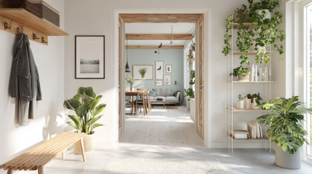 Bright open hallway with modern coat hanger, cozy living area and dining space, stylish houseplants blending with clean minimalist decor