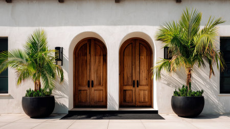 Clean architectural exterior featuring arched wood doors and tropical planters, white stucco wall, black mat in front, perfect balanced symmetry, warm natural tones