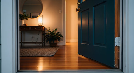A view looking through an open dark blue door reveals a warm and inviting home entryway featuring a console table, lamp, plant, and round mirror. The lighting creates a cozy, welcoming, and hospitable atmosphere.