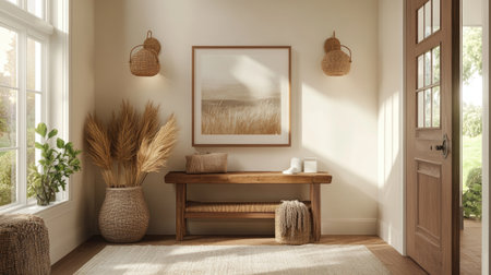 A calm and inviting entryway featuring a wooden bench, earthy decor, and natural light streaming through windows, creating a serene atmosphere.