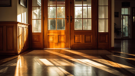 A stunning interior scene featuring sunlight pouring through beautifully crafted wooden doors. The warm tones and elegant design create an inviting and tranquil atmosphere.