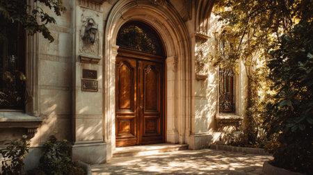 A stunning wooden door set within an ornate architectural facade, surrounded by vibrant greenery and filtered sunlight, evokes a sense of tranquility and charm.
