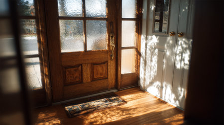 A warm and inviting entrance features a textured glass door and rich wooden floor, illuminated by soft sunlight, creating a serene and cozy atmosphere perfect for homes.
