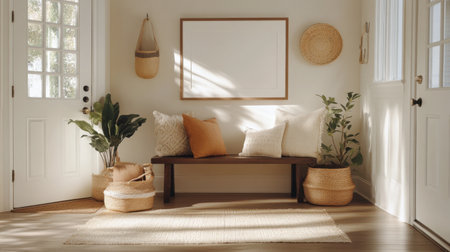 A beautiful and inviting entryway featuring a wooden bench, soft cushions, and lush indoor plants. The natural lighting creates a warm and cozy atmosphere.