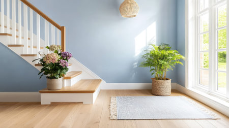 This inviting entryway features a charming staircase, vibrant indoor plants, and beautiful flowers, all complemented by a soft blue wall. The cozy decor and natural light create a warm and welcoming ambiance, ideal for any home.