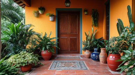 A colorful front door with a wooden frame and a large potted plant in front of it. The door is surrounded by a variety of potted plants, including some in vases, and a rug on the ground