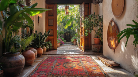 Sunlit cozy hallway with plants and woven rug leading to bright sitting area. That the image is generated using AI.