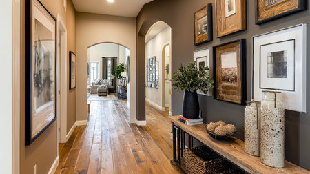 A minimalist entryway with a streamlined console table, subtle artwork, and a functional coat rack, creating a welcoming and uncluttered first impression.