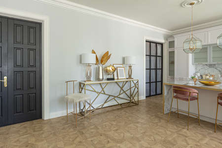 Luxury fashionable modern design studio apartment with a free layout in a minimal style. very bright huge spacious room with white walls and wooden elements.