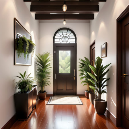 Symmetrical hallway with white cased opening and plants. Interior of a house with two potted plants facing each other with a passage in the middle with carpeted flooring.